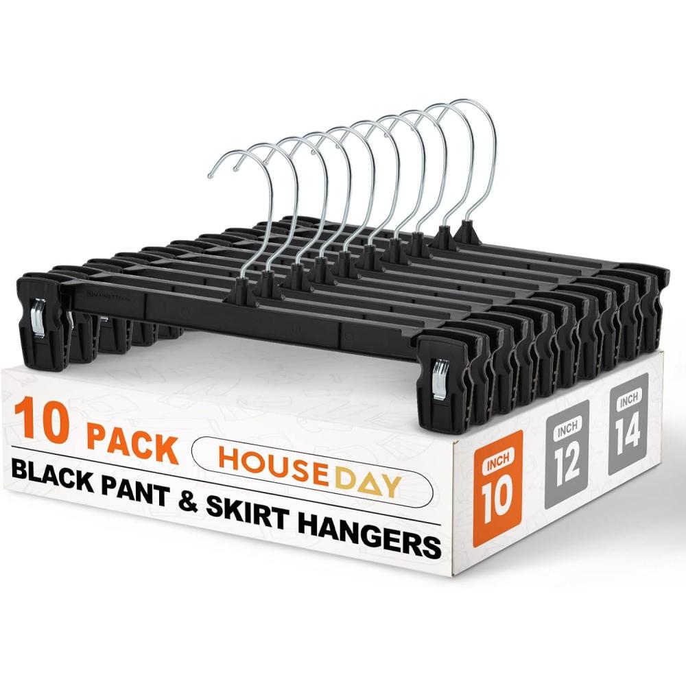 HOUSE DAY Pants & Skirt Hangers – 10 Pack Pants Hangers with Non-Slip Big Clips – Closet Hangers for Shorts, Shirts, Jeans, Slacks, Clothes, Clothing – Durable, Slim & Space Saving, Black – 12 Inch(Black)